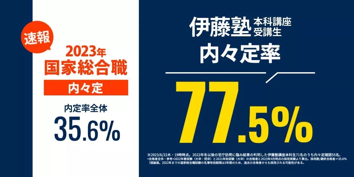 2023年6月22日17時、2024年4月採用の国家総合職職員の内々定解禁を迎えた。それを受け、法律資格専門の受験指導校『伊藤塾』(塾長 伊藤真)を運営する株式会社法学館(所在地:東京都渋谷区)は、本科講座受講生の内々定実績の速報を公開した。