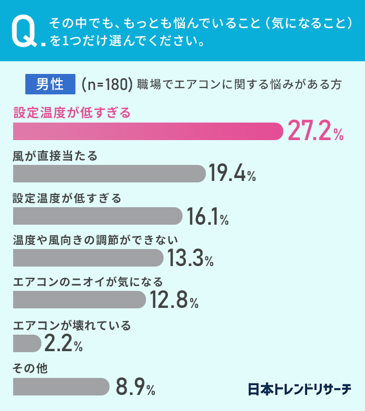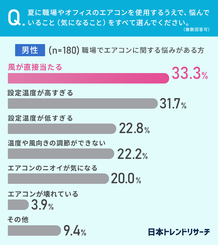 男性は「風が直接当たる」や「設定温度が高すぎる」といった悩みを挙げていました。
