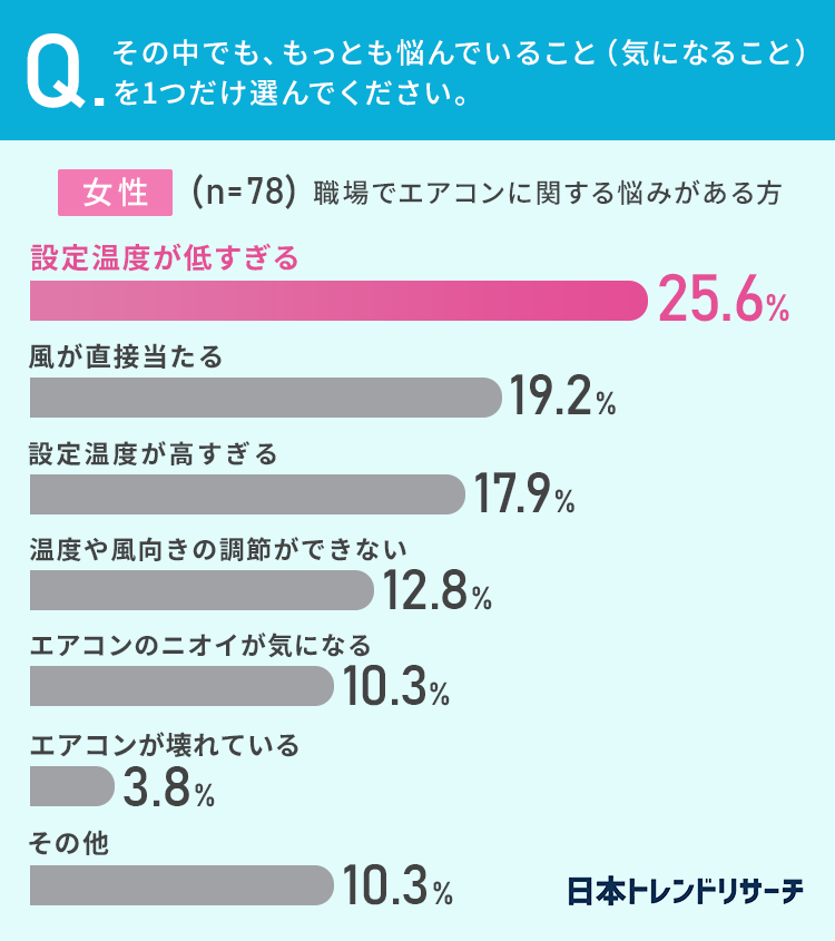 女性がもっとも多く悩んでいるのは「設定温度が低すぎる」ことであると分かりました。