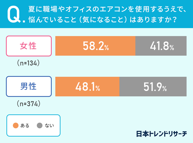 女性の半数以上が、夏に職場やオフィスのエアコンを使用するうえで、悩んでいること(気になること)が「ある」と回答しました。