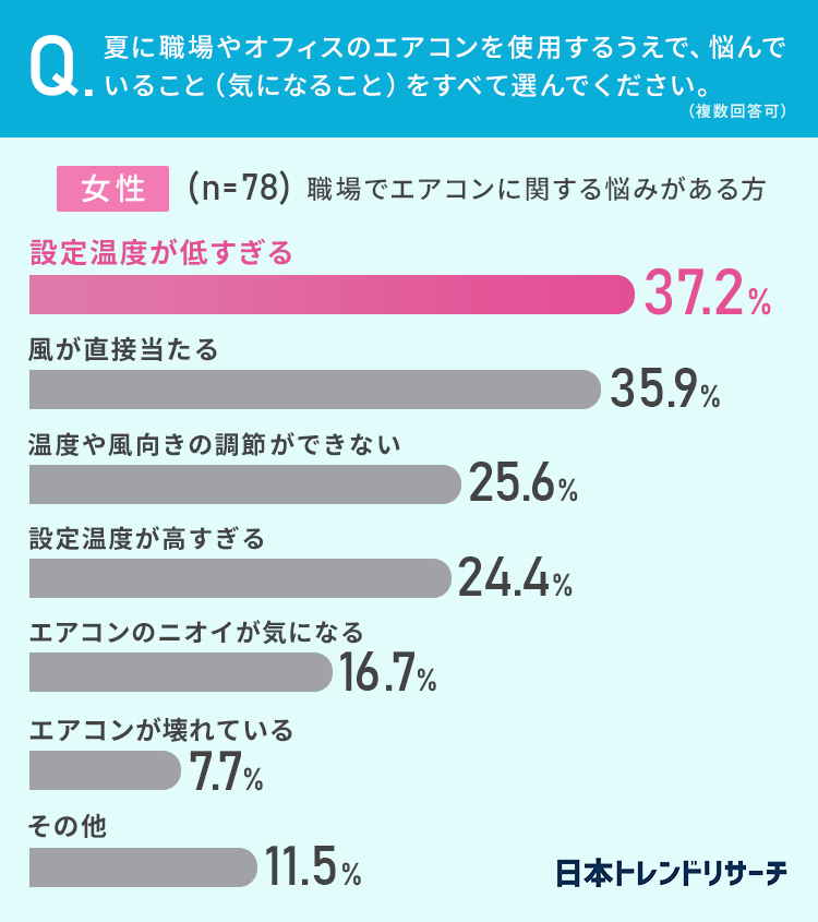 女性は「設定温度が低すぎる」や「風が直接当たる」といった悩みがあるようです。