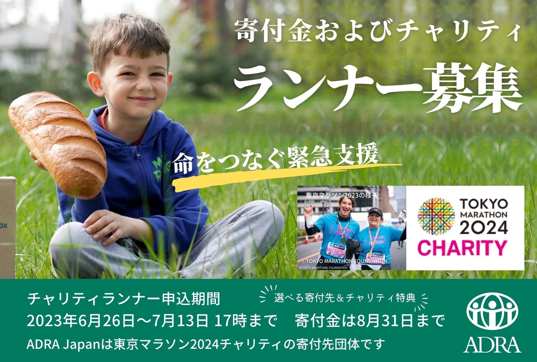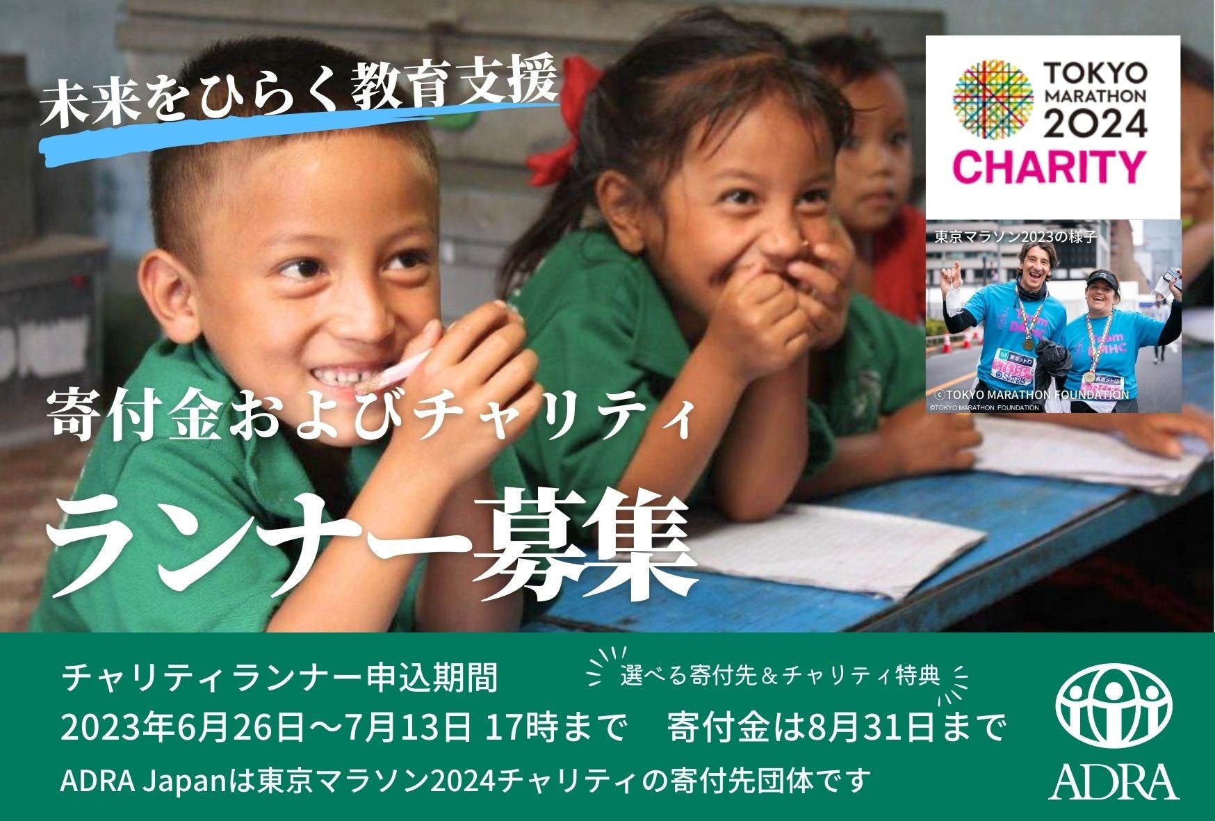 認定NPO法人ADRA Japan (アドラ・ジャパン、 所在地:東京都渋⾕区神宮前1-11-1 理事長:柴⽥俊生)は、「東京マラソン2024チャリティ」のご寄付とチャリティランナーを募集します。