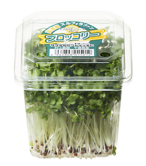 特定の品種のブロッコリーの新芽(スプラウト)で、有用成分「スルフォラファン」の含有量を成熟ブロッコリーの10倍以上と高濃度に含む高成分野菜です。米国ジョンズ・ホプキンス大学医学部で開発され、国内では同大学と独占ライセンスを結んだ当社だけが生産・販売しています。