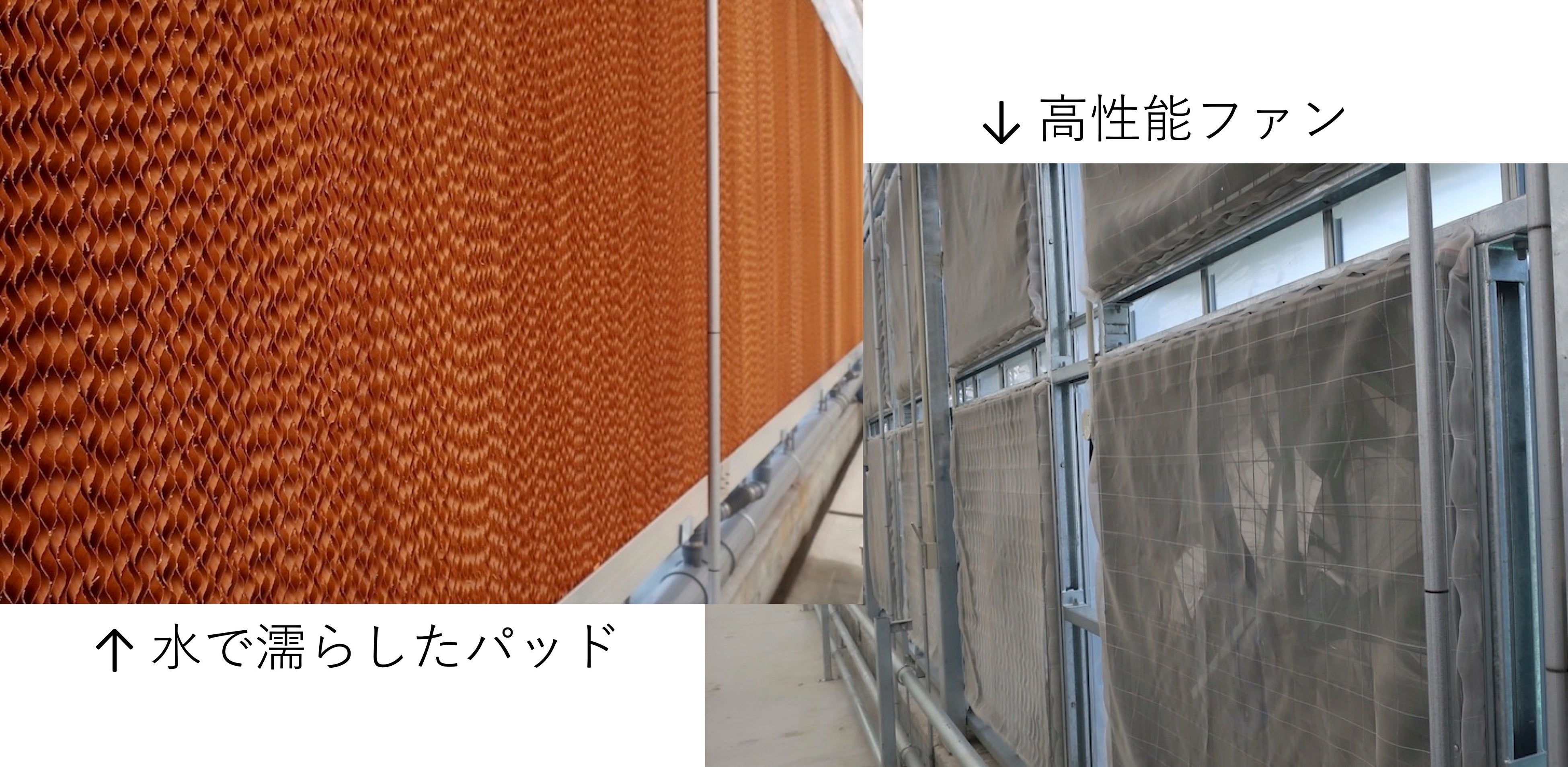 ハウス側面の片方に水で濡らしたパッドを設置し、反対の側面の大型換気扇で排気・通風。気化熱を利用したエコな冷房システム。72台の高性能ファンを設置しています。