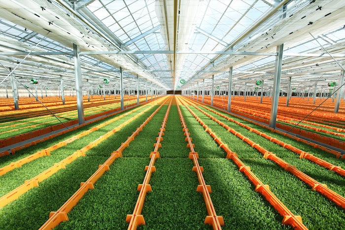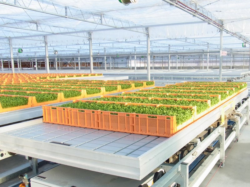 同システムとしては純国産第一号。栽培容器を載せたベンチを、コンピュータ制御で 播種場〜緑化場〜予冷庫 まで移動させ、搬送作業の自動化を実現。中央制御室から一括制御可能な最新システムを採用しています。