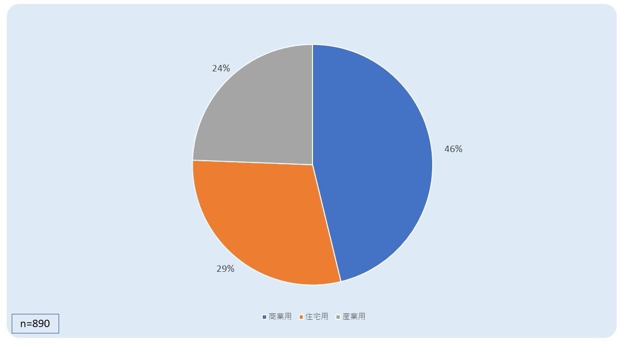 - 業種別では、「商業」が46.2%と最も多く、次いで「住宅」(29.4%)、「工業」(24.4%)と続きました。