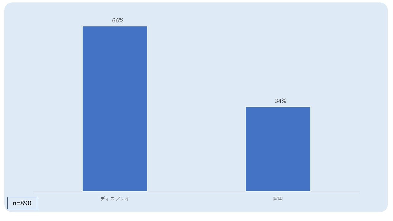 - 回答者の大半(66.1%) は、御社は主にディスプレイ用途でマイクロ LED を製造または利用しており、33.9%は照明用途で利用していると答えました。
