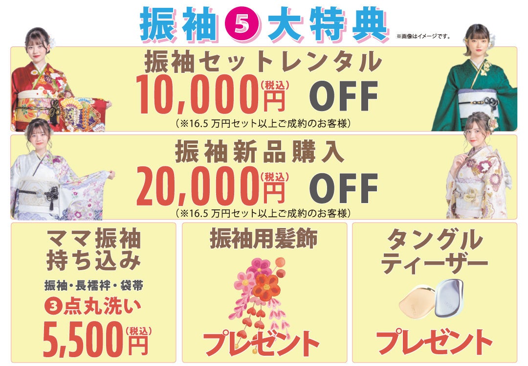 ※髪飾り・刺繍衿はセットには含まれません。※プレゼントは振袖をお持ち込みの方は対象外です。