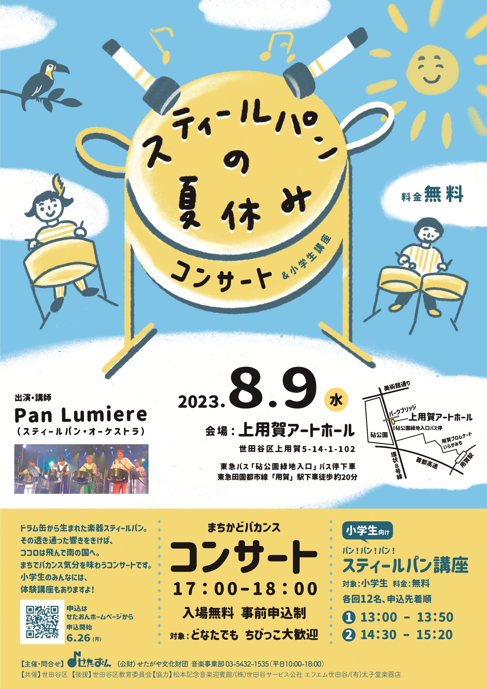 ドラム缶から生まれた楽器・スティールパン。その透きとおった音を聞けば、そよそよ、ウキウキ。まちでバカンス気分を味わうコンサートです。ちびっこも歓迎!