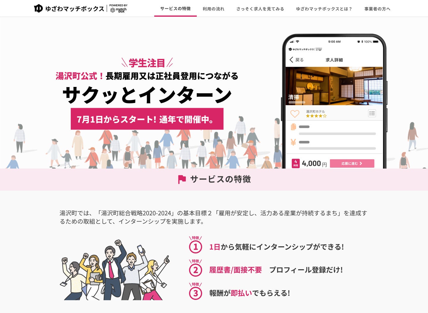 6月28日(水)から特設サイト(URL:https://matchbox.jp/niigata/yuzawa/sakutto-intern)をオープンし、7月1日(土)にサービスを開始します。今回の取組により、学生はwebサイトやスマートフォンのアプリケーションから湯沢町のさまざまな事業者のインターンシップに履歴書・面接不要で応募が可能になります。マッチボックステクノロジーズがプラットフォームの提供および管理保守・運⽤を⾏い、インターンシップの募集を行いたい企業はマッチボックステクノロジーズに利⽤申し込みを⾏います。今回の湯沢町との取組を初とし、当社は今後「サクッとインターン」を他の自治体や企業にも提供します。