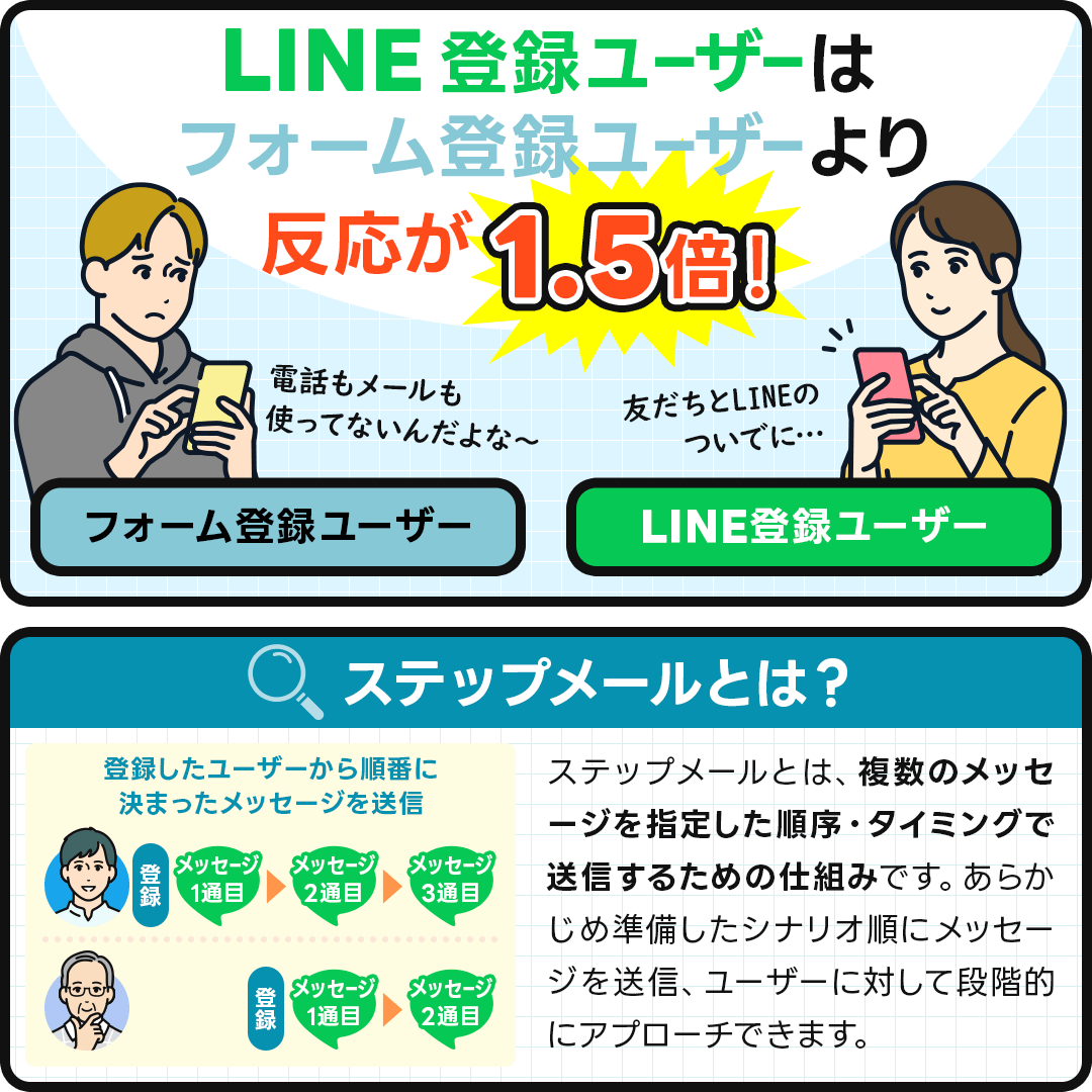 LINE登録ユーザー100人に対してステップ配信をしたところ、フォーム登録ユーザーと比べて1.5倍の反応があり、訪問へと多く促すことができるという結果になりました。