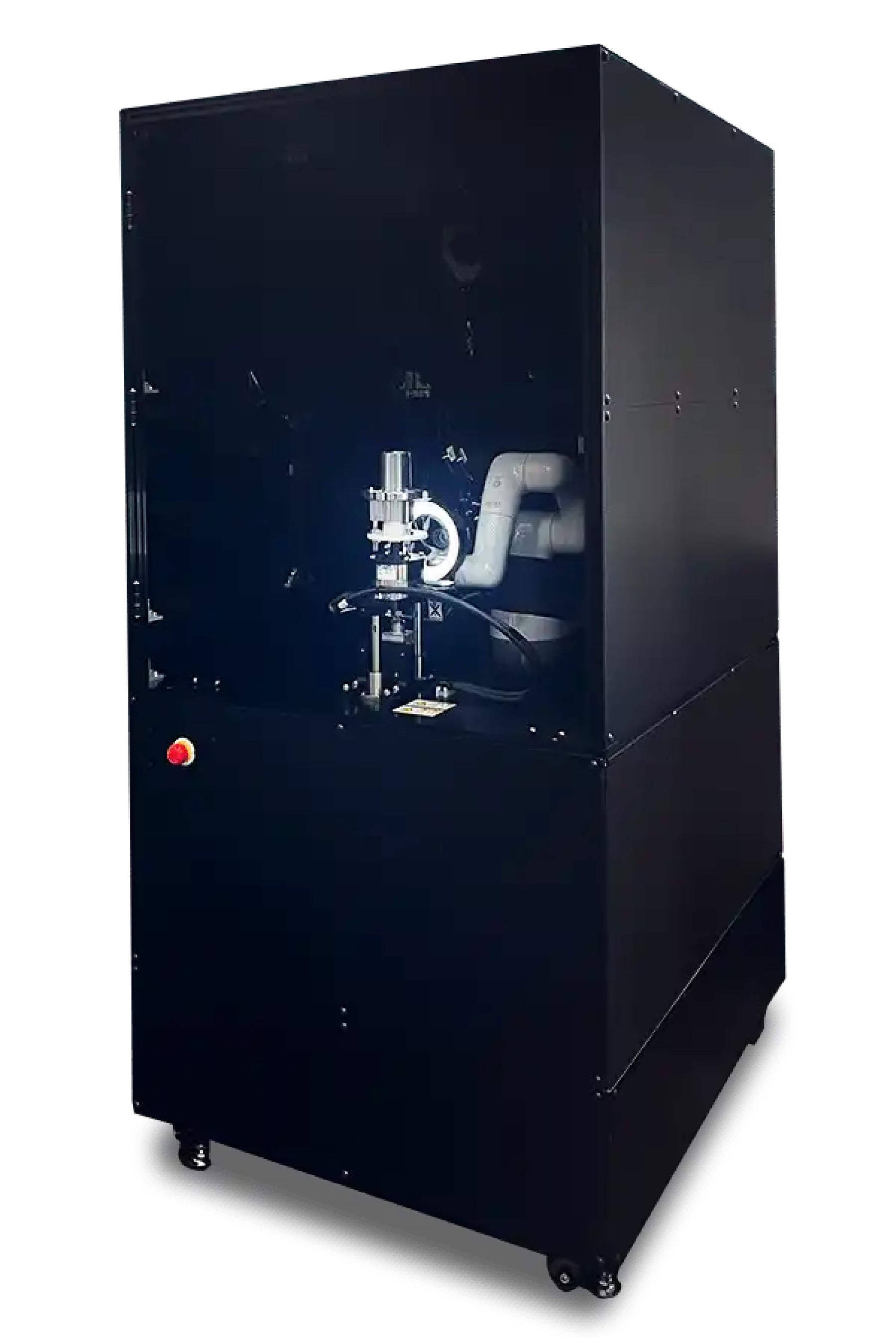 協働ロボット、照明付きカメラ、高性能AI検査ソフトウェアを組み合わせたAI外観検査システムです。従来検査が難しかった複雑形状の立体物を全方位から撮影して360度検査を行い、0.1ミリの不具合まで検出します。