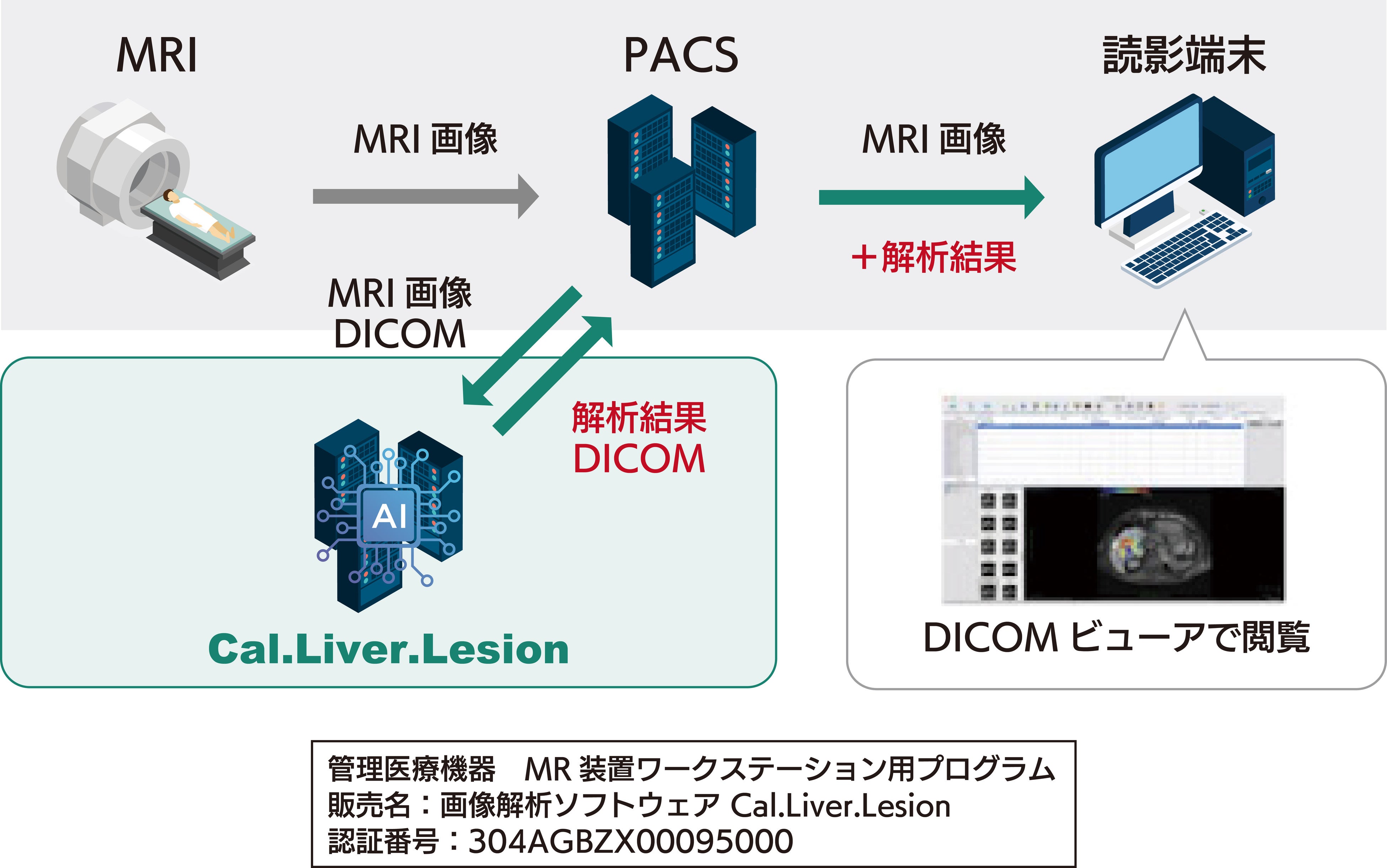 「Cal.Liver.Lesion」は、国立大学法人神戸大学大学院医学研究科 放射線医学分野との共同研究を経て、開発された製品で、MRI で撮像された画像から、周囲と比べ信号値の異なる領域を自動抽出し、カラーマップを作成することで抽出領域の視認性向上を図るプログラム医療機器です。