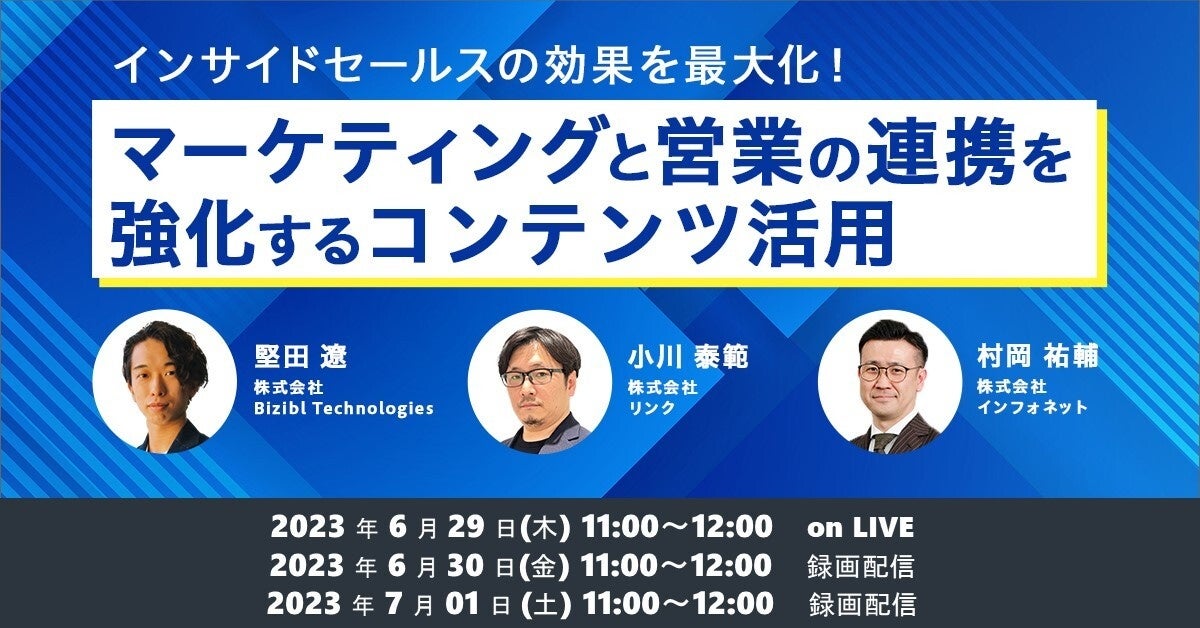 本ウェビナーではBizibl、リンク、インフォネットの3社で「コンテンツマーケティング」と「インサイドセールスでの活用方法」について語ってまいります。