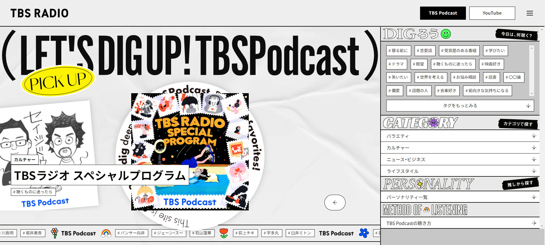 リニューアルしたTBS Podcastのウェブサイトは、カルチャーを掘り下げることを楽しむ「Digる (深掘るという意味)」をコンセプトとし、「TBS PodcastをDigろう」というテーマのもとにデザインされました。ユーザーは直感的なナビゲーションを通じて、100を超える番組から興味のあるコンテンツを見つけ出すことができます。詳細は、TBS Podcastの新ウェブサイトをご覧ください。