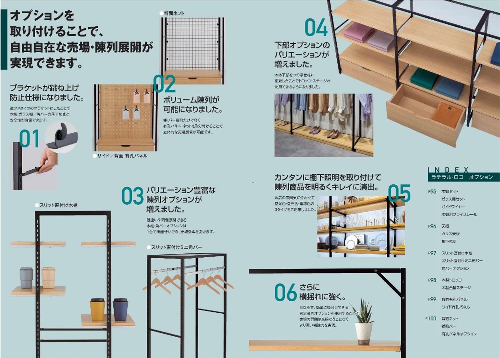 コロナ禍で生活や消費スタイルが変化し、ECサイトなどオンラインの便利さに親しむ一方、リアルの価値やニーズの高まりを受け店舗やオフィスの在り方も変わる、と当社は捉えています。実物を見て・触れる体験など、さらなる変化や鮮度が求められる店舗づくりに対応し、商品やプロモーションに合わせて自由にカスタマイズできる新什器シリーズ「ラテラル・ロコ」や、商品を魅力的に演出する卓上ディスプレイなどの新商品を販売します。また、人流・オフィス回帰にともなう、オフィススペースや休憩エリアなど人が集まる場の環境改善ニーズに対応し、人工樹木やオフィス家具類の拡充をはかりました。今回のカタログでは、約1,900点の新商品を展開します。