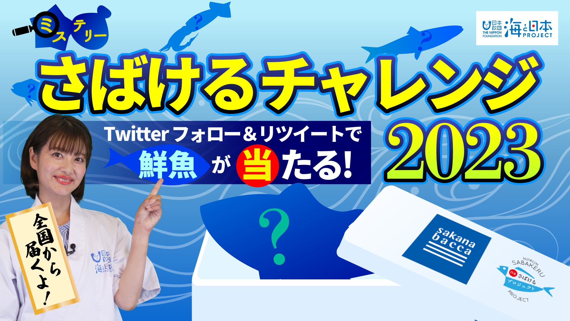 「ミステリーさばけるチャレンジ2023」は、日本さばけるプロジェクトの一環として行われるTwitterキャンペーンです。公式Twitterアカウント(@sabakeru)をフォローして、キャンペーンtweetをリツイートしたユーザーに、「sakana bacca(サカナバッカ)」が全国から仕入れた魚をプレゼントします。