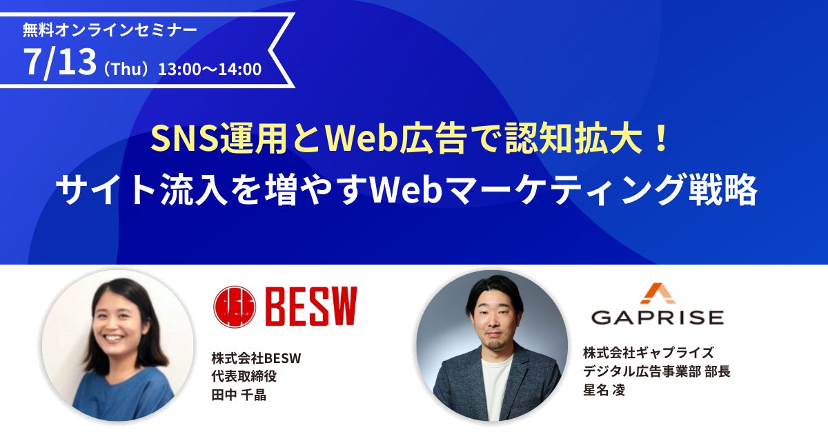 デジタルビジネス支援を行う、海外SaaS商社の株式会社ギャプライズ(本社:東京都千代田区、代表取締役 CEO:甲斐 亮之、以下「当社」)は、7月13日(木)13時より、株式会社BESWと共に「SNS運用とWeb広告で認知拡大!サイト流入を増やすWebマーケティング戦略」と題しましたオンラインセミナーを開催する事をお知らせいたします。