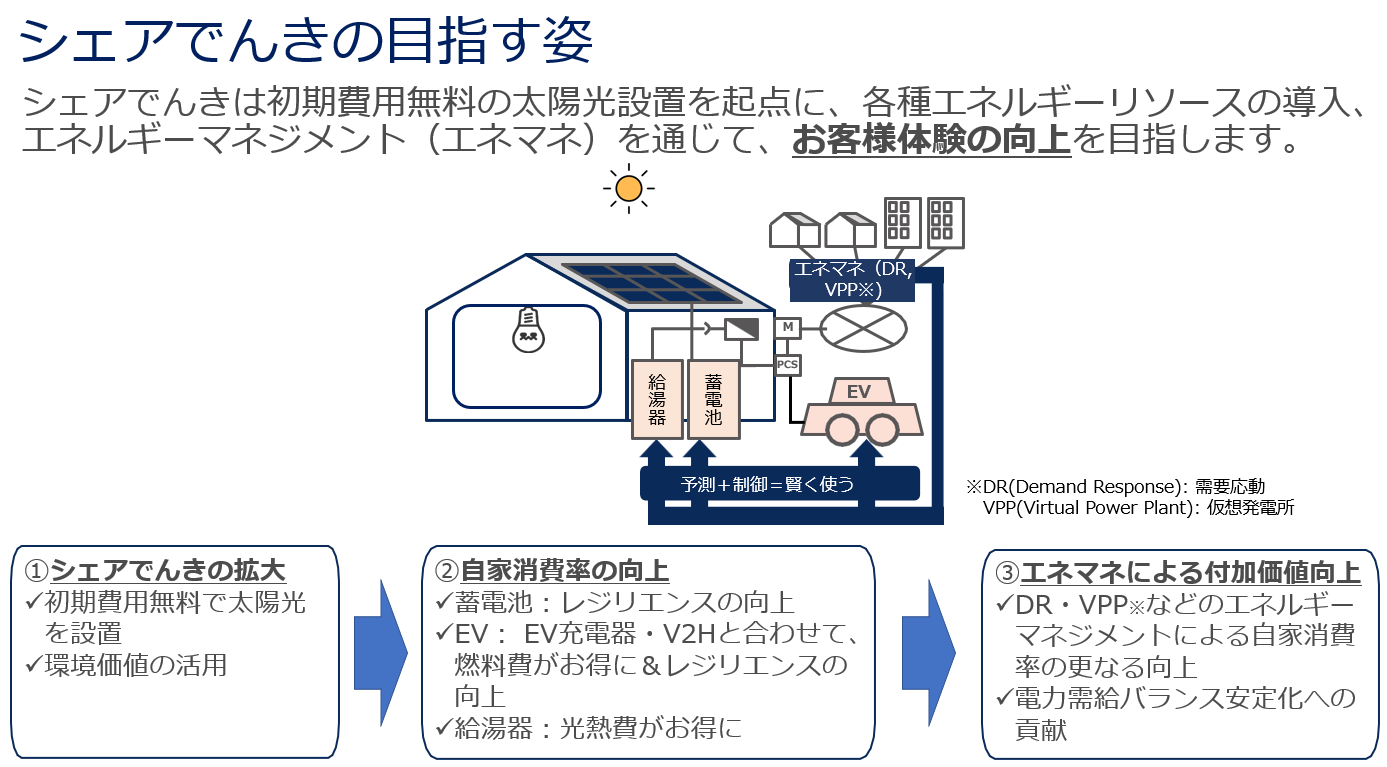 当社は、初期費用無料で太陽光発電を設置して電気代をお得にするサービス「シェアでんき」事業を展開しています。2018年より住宅向け太陽光発電を中心に提供を開始し、その後の約5年間で契約申込数は1万件に達しました。また、2023年2月からは事業者向けの「シェアでんき forBiz」の提供も開始しました。さらに、「シェアでんき」のさらなる活用と効率的なエネルギー利用を目指し、エネルギーマネジメントサービスの開発にも取り組んでおります。