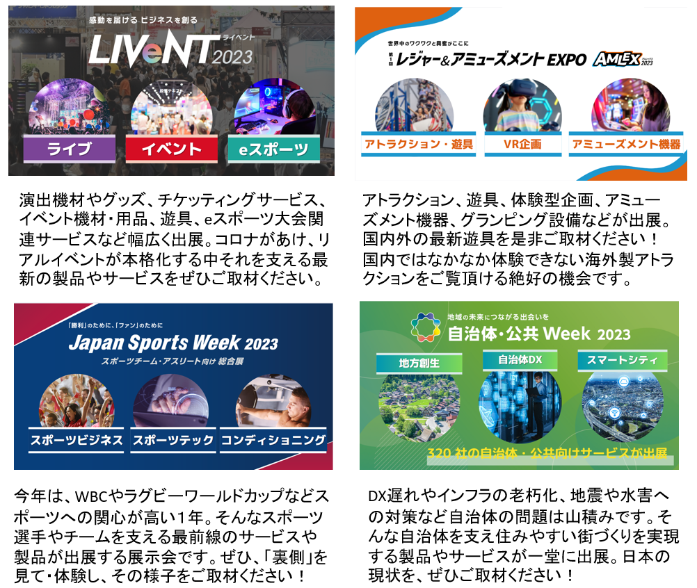 RX Japan株式会社(本社:東京都中央区、代表取締役社長:田中 岳志)は2023年6月28日(水)~30日(金)の3日間、東京ビッグサイトで「LIVeNT 2023」「第1回 レジャー&アミューズメントEXPO」「Japan Sports Week 2023」「自治体・公共Week 2023」を開催します。