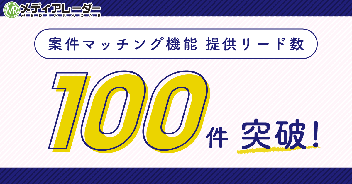 メディアレーダーは、サイト上でプロモーション施策の提案募集を行い、複数の媒体社から提案を受けられる「案件マッチング機能」を2023年4月3日より実装しています。そして、実装から2カ月経過した2023年6月3日に提供リード*²数が100件*³を突破しました。