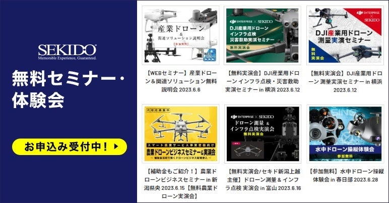 セキドでは、より多くの事業者の方にドローンを使った業務効率の改善を実現していただくため、業務用ドローンや関連ソリューションをご紹介する無料セミナーやイベントを定期的に開催しております。今後もオンラインや全国各地での開催を予定しておりますので、ご興味をお持ちのイベントにはぜひお気軽にご参加ください。