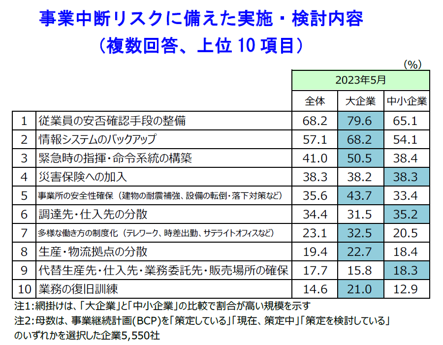「大企業」では従業員の安否確認や情報システムの管理などの備えを重視し、「中小企業」では「調達先・仕入先の分散」や「代替生産先・仕入先・業務委託先・販売場所の確保」といったサプライチェーンに関する備えが「大企業」と比較して高かった。