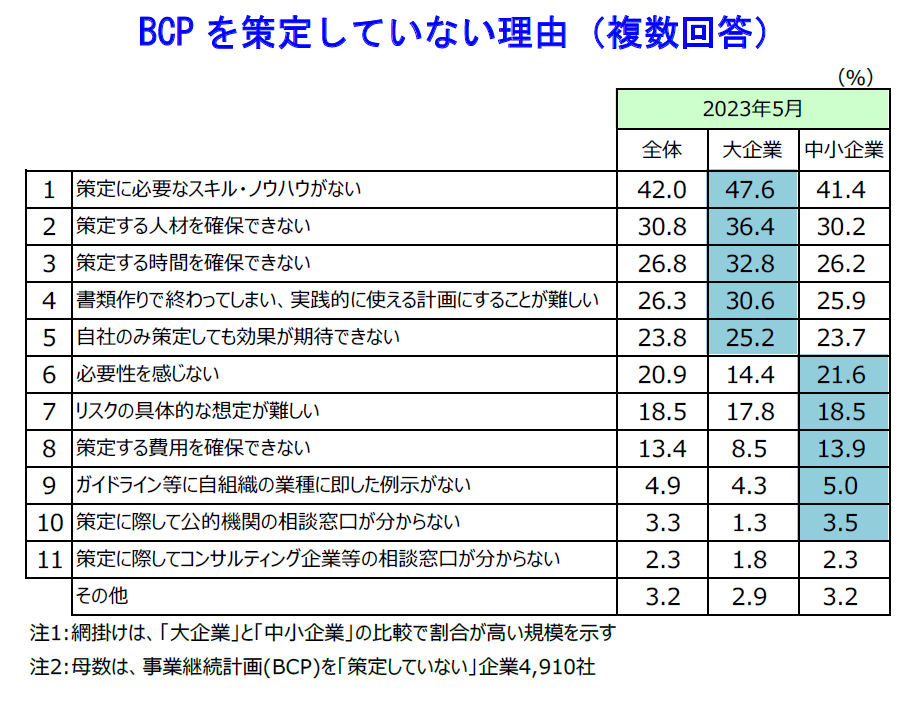 一方で、BCPを策定していない企業では、「策定に必要なスキル・ノウハウがない」ことを理由にあげる企業が4割超に及んでいる。そのほか、策定する人材や時間を確保できないと考える企業の割合も高いことが策定への大きな障壁となっているようだ。