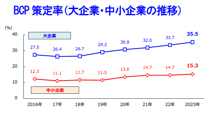 BCP策定率を規模別にみると、「大企業」が35.5%(同1.8ポイント増)、「中小企業」が15.3%(同0.6ポイント増)となった。「大企業」は2016年からは8.0ポイント上昇している。一方、「中小企業」は3.0ポイントの上昇にとどまった。