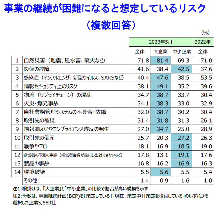 想定リスクは「自然災害」が7割でトップ 「感染症」は13.1ポイント低下