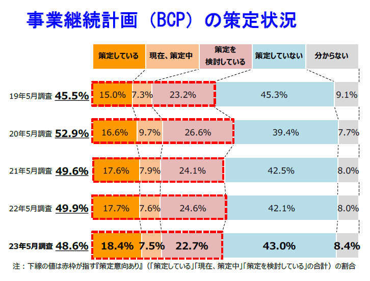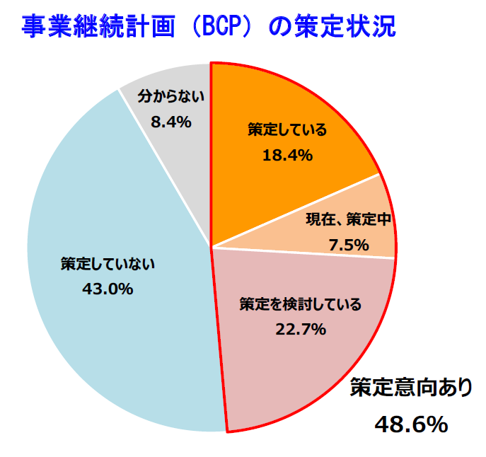 企業のBCP策定率は18.4%、『策定意向あり』は48.6%と3年連続で5割を下回る
