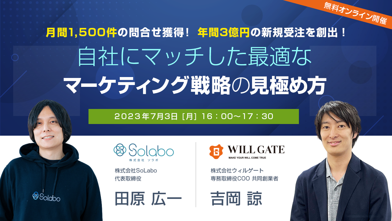 ウィルゲートからは専務取締役COOの吉岡諒より、弊社が実施したBtoBマーケティングの成功の秘訣3つの”S”、「ソーシャルセリング」(SNS経由で年間3億円受注)、「セミナー」(年間80回開催しハウスリストが約1万件増加)、「SEO対策」(難関ワード「SEO」で1位を獲得)についてお話しいたします。