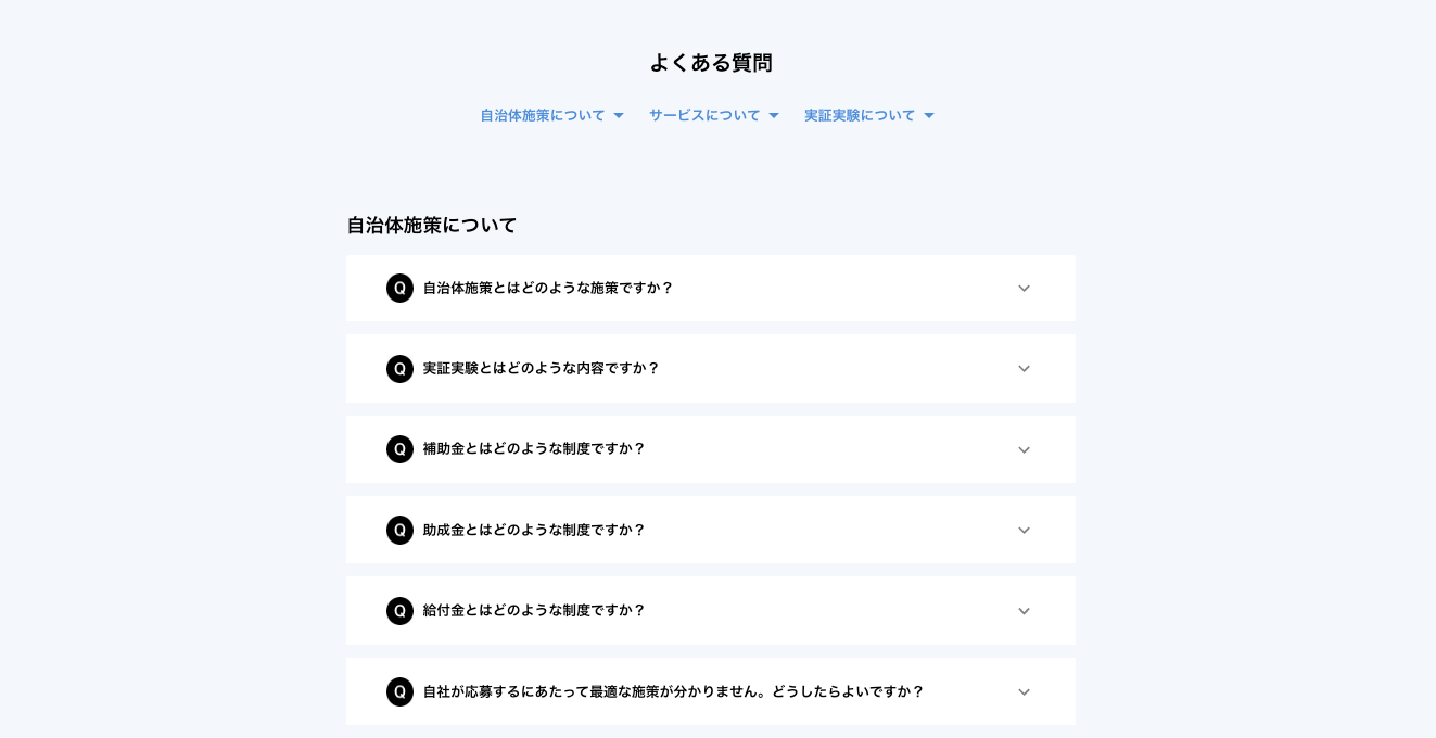 「自治体施策について」「実証実験について」「サービスについて」の3つのカテゴリで計30以上のQ&Aを掲載しました。自治体施策のメリットについても掲載しています。