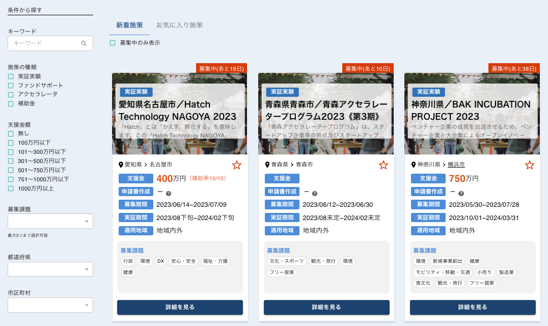 施策の種類、支援金額、募集課題の分野、地域などによって施策の検索が可能になりました。各企業に合った施策を閲覧いただけます。