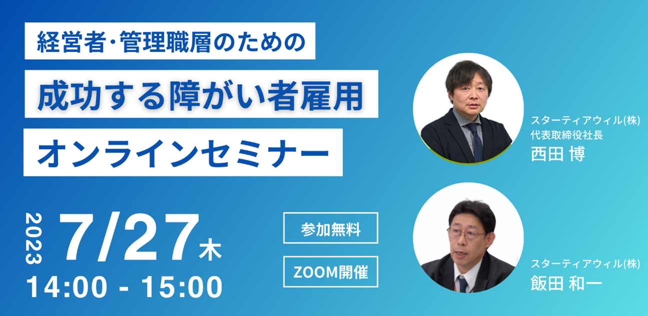 本セミナーでは、スターティアウィルが障がい者の職場環境改善と生産性向上に取り組んできた事例をご紹介します。また、これから深刻化する労働力不足を受けて、デジタルトランスフォーメーション(DX)などを推進し、障がい者の人材戦力化を推進してきたノウハウをお伝えします。