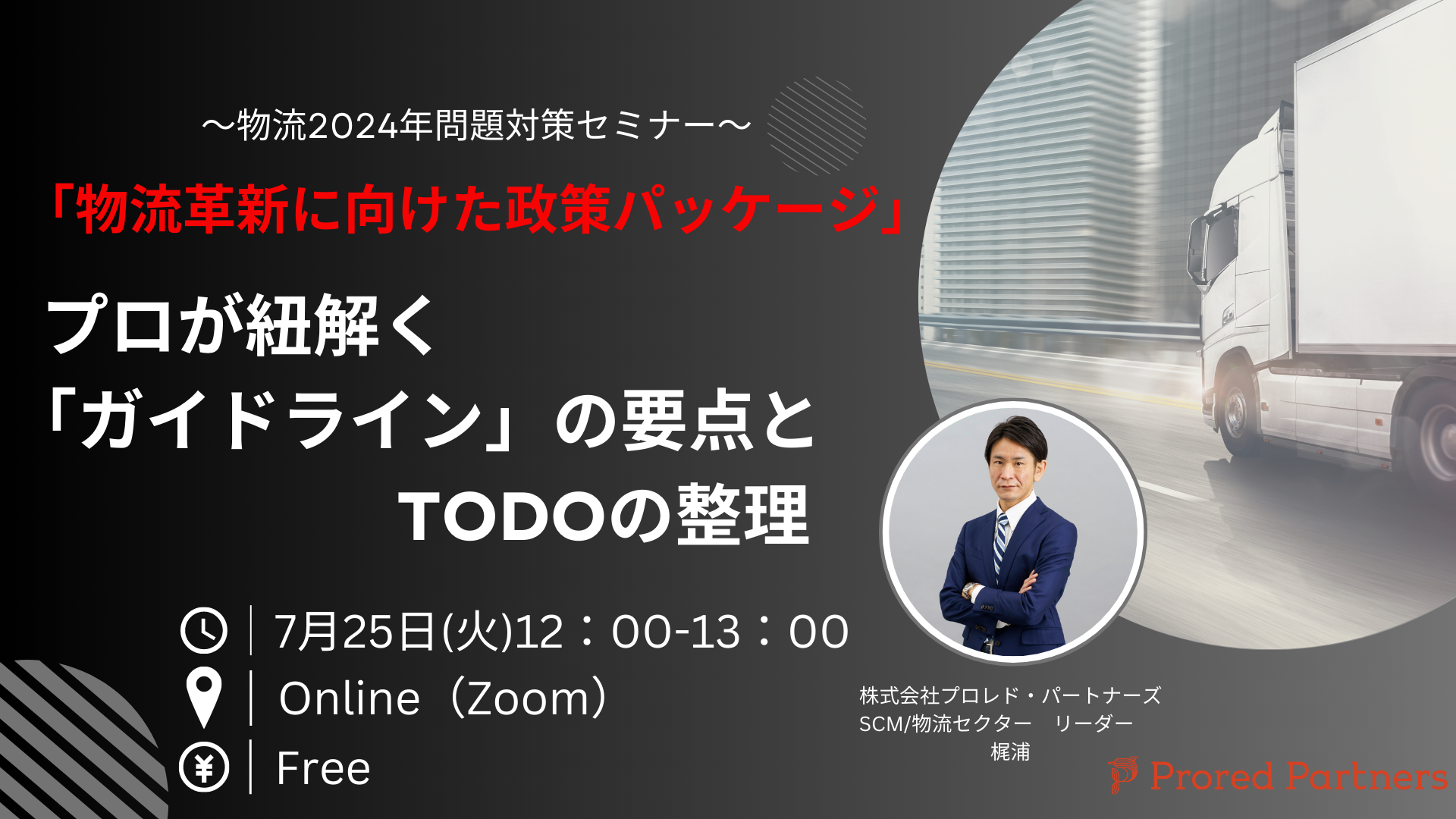 株式会社プロレド・パートナーズ(本社:東京都港区、代表取締役:佐谷 進、証券コード:7034)はこの度、無料オンラインセミナー『「物流革新に向けた政策パッケージ」~プロが紐解く「ガイドライン」の要点とTODOの整理~』を開催いたします。
