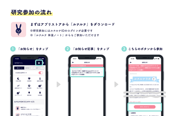 参加方法:『ルナルナ』アプリまたは『ルナルナ 体温ノート』を開く > メニュー > お知らせ より参加