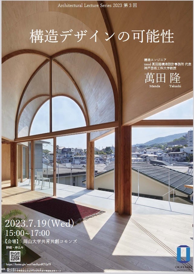 第3回は「構造デザインの可能性」と題して、構造エンジニアでtmsd萬田隆構造設計事務所代表、神戸芸術工科大学教授の萬田隆氏をお招きして、2023年7月19日(水)15:00~17:00に岡山大学津島キャンパスの岡山大学共育共創コモンズ(OUX)で開催します。