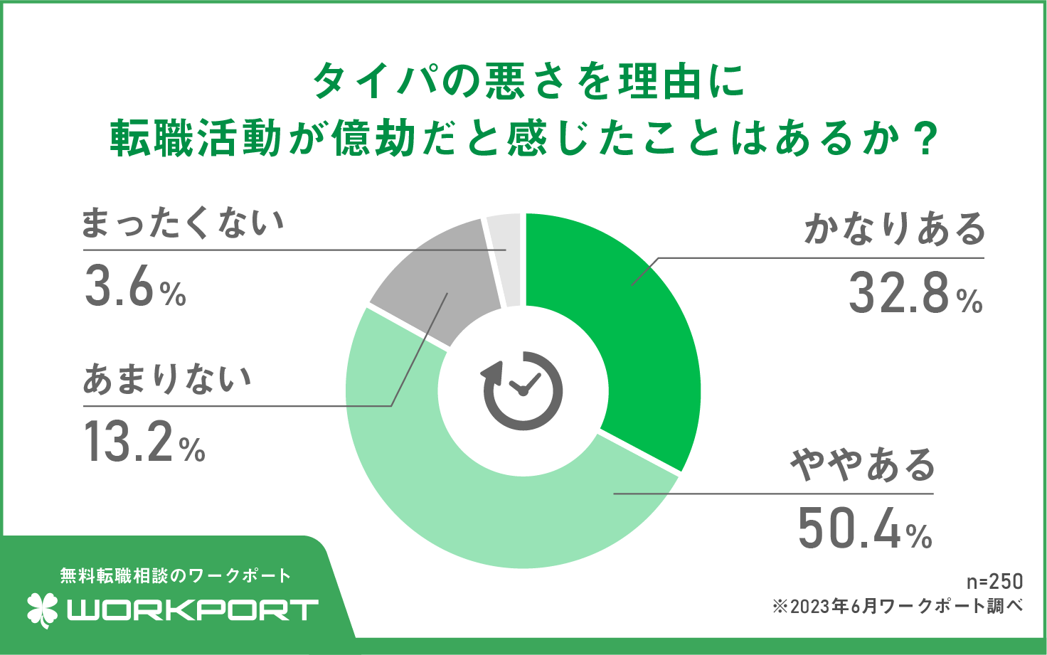 続いて、転職活動でタイパの悪さを感じる場面があると回答した人に、タイパの悪さを理由に転職活動が億劫だと感じたことはあるか聞いたところ、「かなりある」(32.8%)、「ややある」(50.4%)が合わせて83.2%と8割を超える結果となりました。大多数の人にとって、タイパの悪さは転職活動のモチベーション低下に直結することがわかりました。
