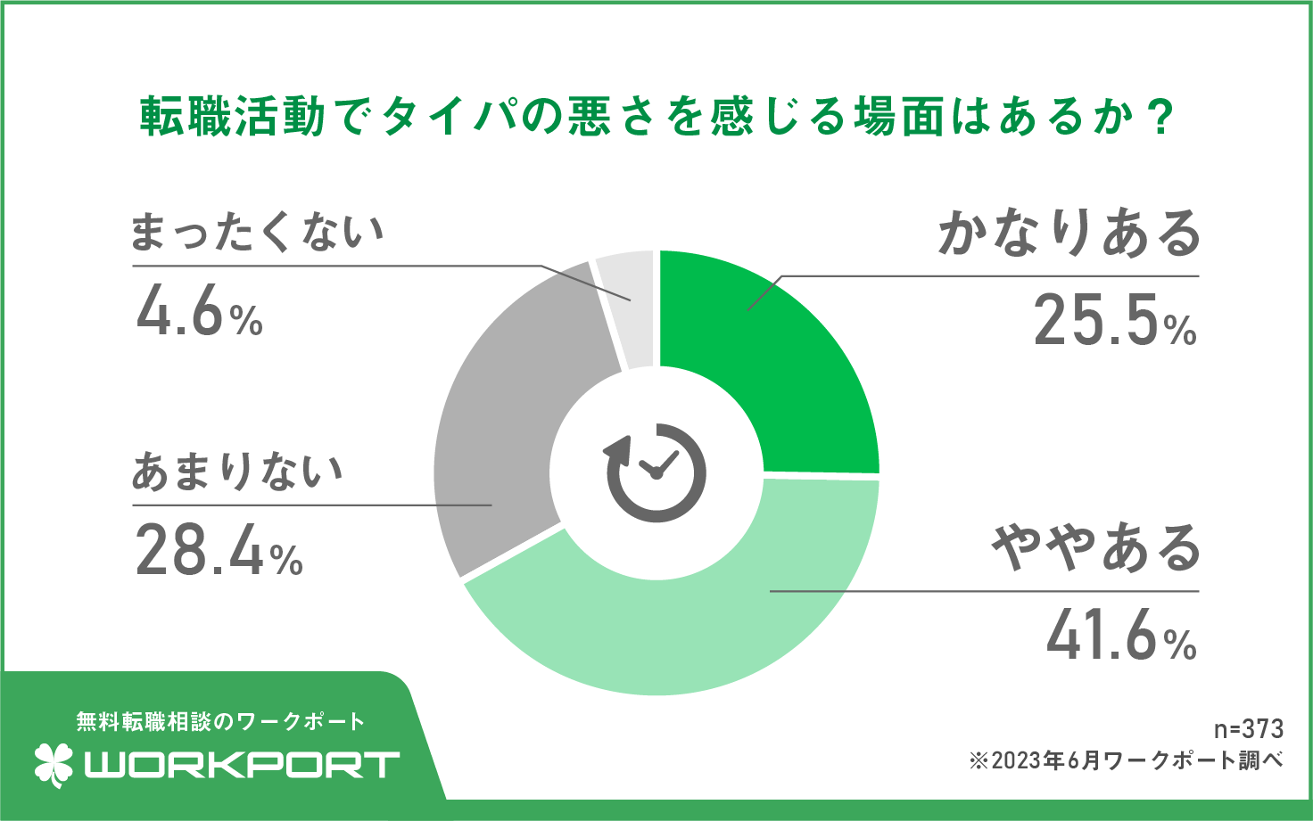 次に、対象者全員に転職活動において、タイパの悪さを感じる場面はあるか聞いたところ、「かなりある」(25.5%)、「ややある」(41.6%)が合わせて67.1%でした。7割近くに及ぶ多くの人が、転職活動中にタイパの悪さを感じることがあるようです。