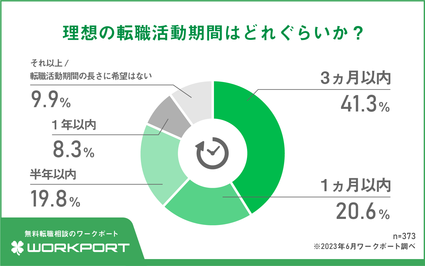 続いて、対象者全員に理想の転職活動期間はどれぐらいか聞いたところ、「3ヵ月以内」と回答した人が41.3%で最多となりました。次いで「1ヵ月以内」(20.6%)、「半年以内」(19.8%)となり、なるべく長期化させたくないと考える人が多いようすがうかがえました。