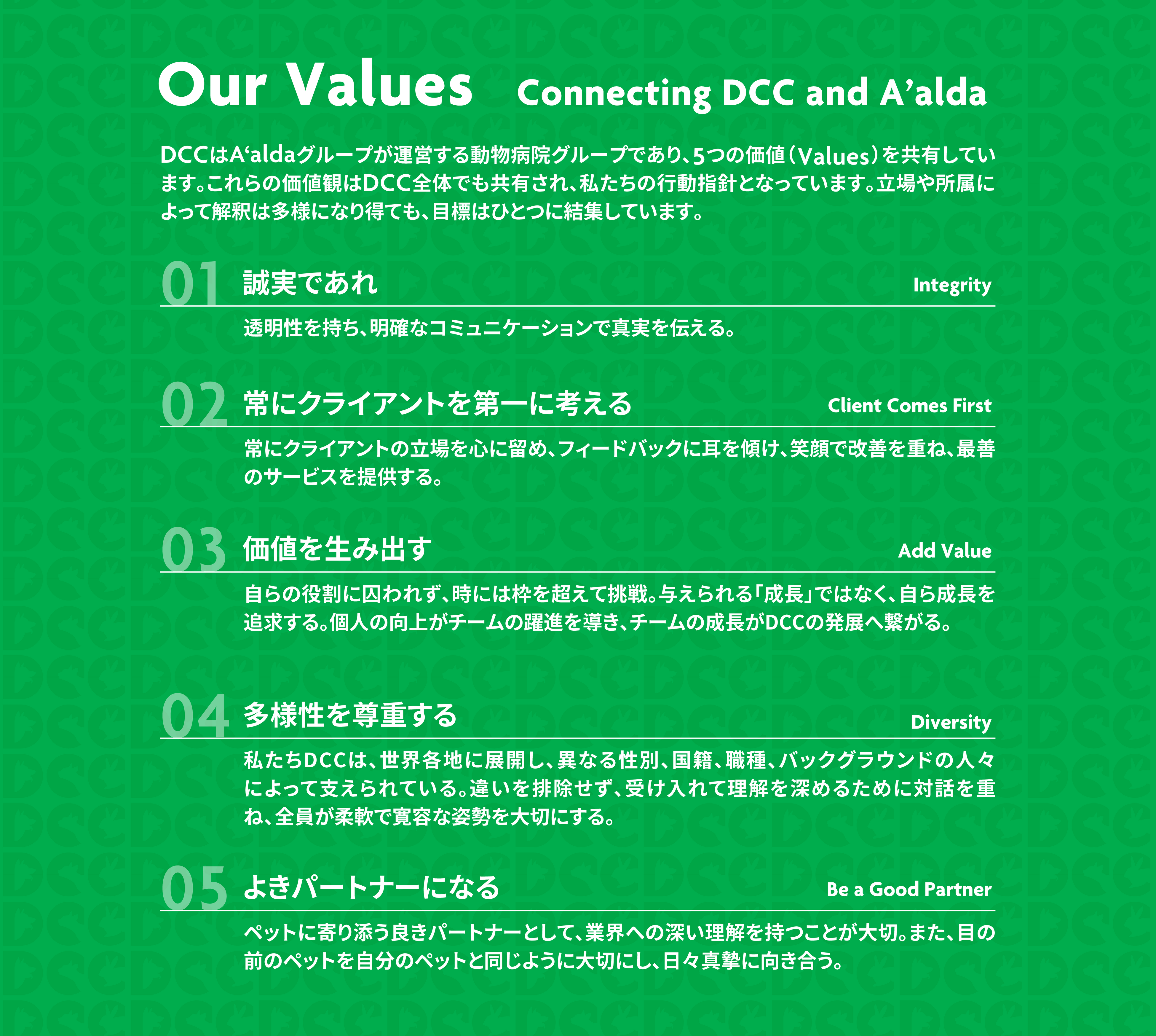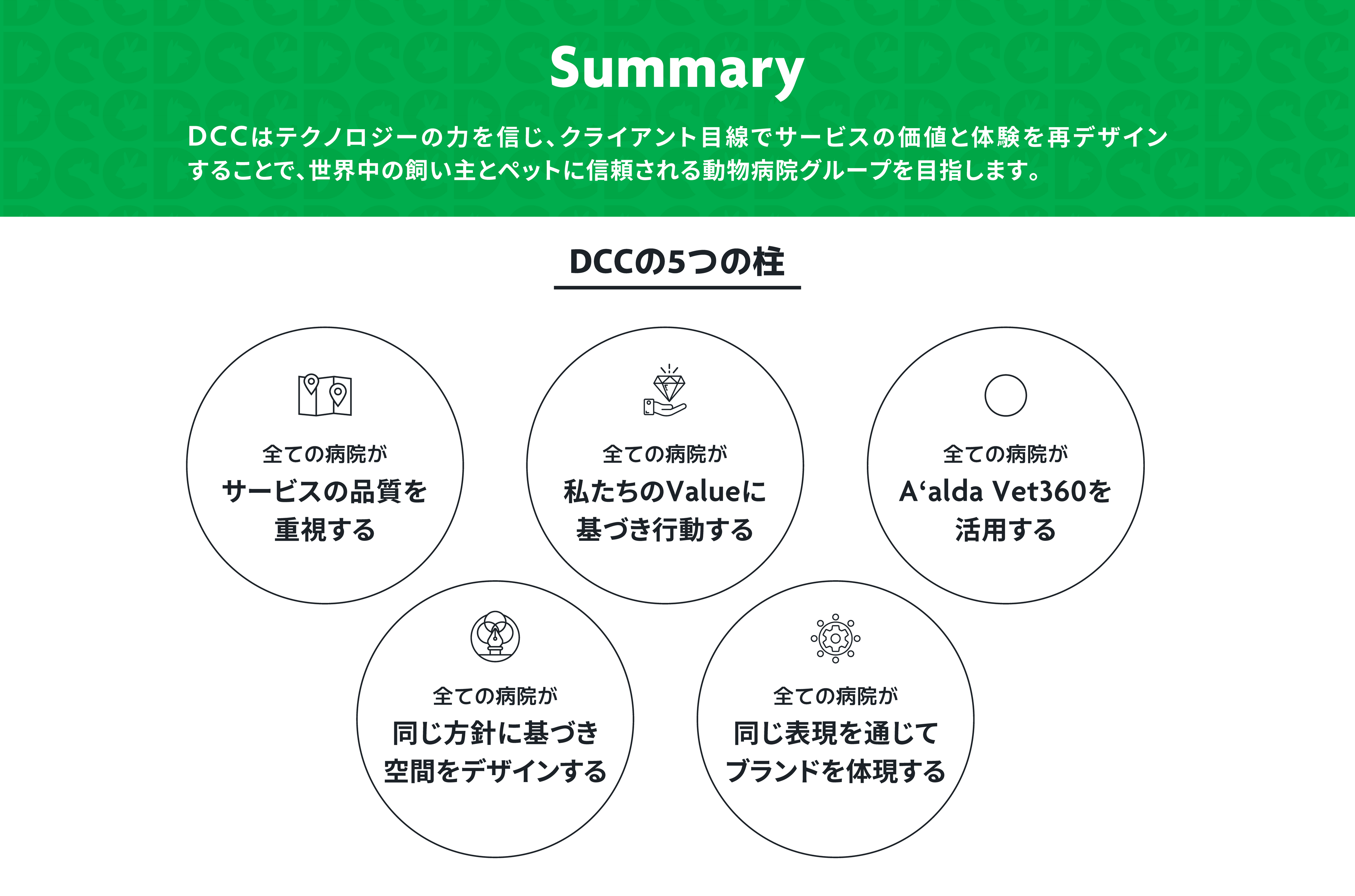 2023年6月5日に「株式会社ワンヘルスコーポレーションが運営する動物病院の名称変更に関するお知らせ」(https://aalda.com/ja/news/202306051917/) を発表いたしましたが、続報として、新たに展開する動物病院グループ「DCC動物病院(英語表記:DCC Animal Hospital)」が今後どのような動物病院グループを目指すのかを指し示す「DCC SPIRIT」及び新サービスロゴを公開したことをお知らせいたします。また、A’aldaグループ総院長である中村篤史から「DCC SPIRIT」に込めた想いとブランドに対する考え方をお伝えいたします。