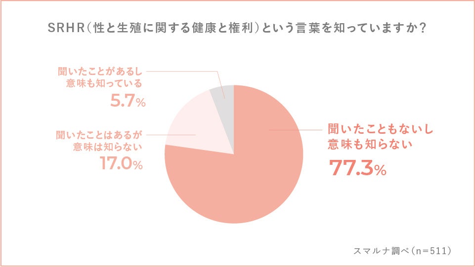 このタイミングを踏まえ、SRHRの認知度の現状についてスマルナユーザーを対象に調査をしたところ、「SRHRという言葉を聞いたこともないし、意味も知らない」が77.3%、「聞いたことはあるが、意味は知らない」が17%と、合計94.3%の人がSRHRを知らないという結果となりました。