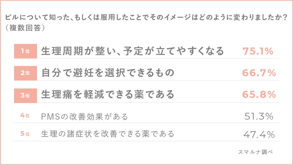 「ピルについて知った・もしくは服用したことでそのイメージはどのように変わりましたか?」と聞いたところ、1位「生理周期が整い、予定が立てやすくなる」(75.1%)、2位「自分で避妊を選択できるもの」(66.7%)、3位「生理痛を軽減できる薬である」(65.8%)となりました。
