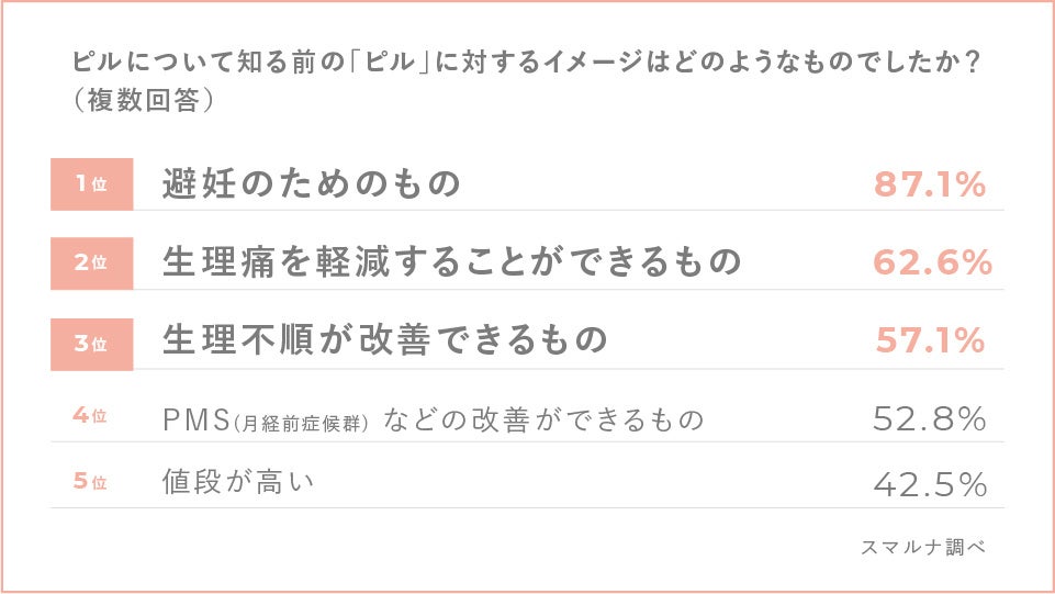また、避妊の一つの手段であるピルについて聞いたところ、ピルについて知る前の「ピル」についてのイメージは「避妊のためのもの」がトップとなりました。