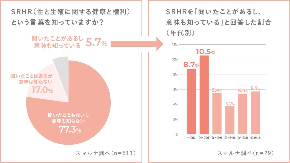 SRHRについて「聞いたこともないし意味も知らない」77.3%、「聞いたことはあるが意味は知らない」17%。「聞いたことがあるし意味も知っている」と回答したのは5.7%にとどまる