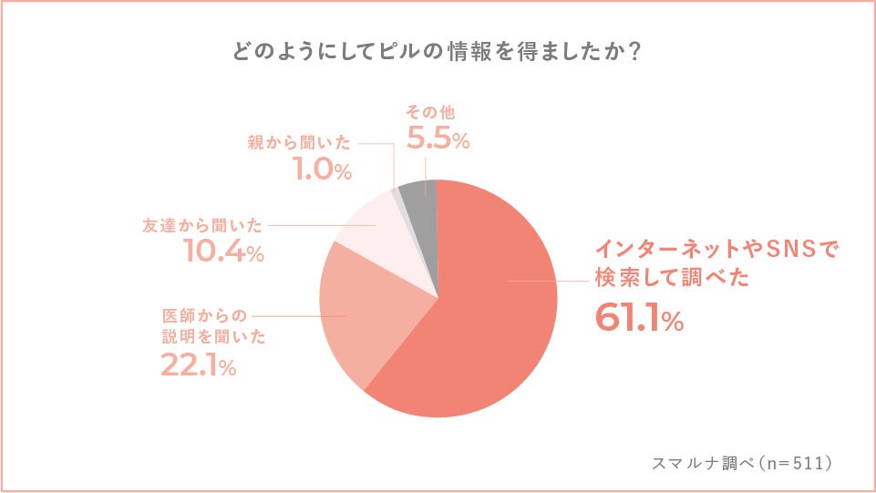 また、ピルの情報をどこから得ているかという質問は「インターネットやSNSで検索して調べた」がトップで61.1%、次いで「医師からの説明を聞いた」(22.1%)、「友達から聞いた」(10.4%)という結果となりました。その他の回答では、「パートナーから勧めてもらった」「テレビニュースで見て知った」という声もありました。