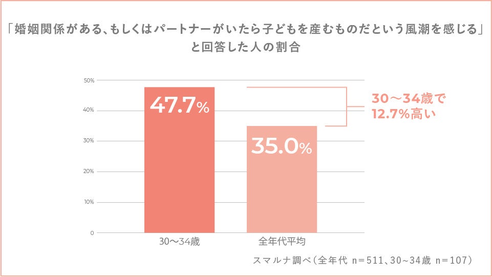 また、「婚姻関係がある、もしくはパートナーがいたら子どもを産むものだという風潮を感じる」という質問に対しては、30〜34歳の人が47.7%という結果が出ており、他年代に比べて12.7%強く感じているという結果が出ました。
