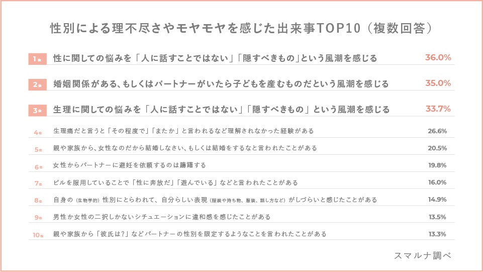 「性別による理不尽さやモヤモヤを感じたことがあるか」当てはまるものを選択してもらったところ、1位は「性に関しての悩みを人に話すべきではない・隠すべきものという風潮を感じる(36.0%)」2位「婚姻関係がある、もしくはパートナーがいたら子どもを産むものだという風潮を感じる(35.0%)」3位「生理についての悩みを人に話すべきではない・隠すべきものという風潮を感じる(33.7%)」という結果となりました。この調査により何らかの性別による理不尽さを感じている人は全体の83.8%に上ることが明らかになりました。