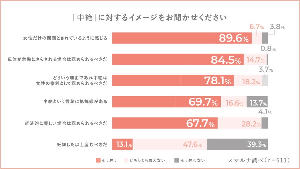 中絶に対して「女性側だけの問題とされているように感じる」と回答した人は89.6%に上りました。また、身体的理由・経済的理由に関わらず「どういう理由であれ中絶は女性の権利として認められるべきだ」と回答した人は78.1%に上りました。
